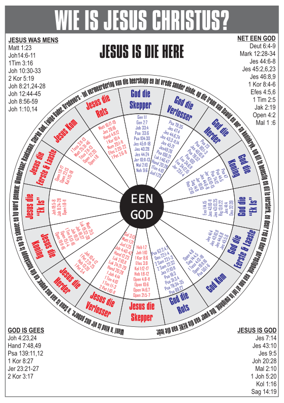 b. Mark. 12:28-30 - "En toe een van die skrifgeleerdes wat bygekom het, hulle hoor redetwis, en wis dat Hy (Jesus) hulle goed geantwoord het, vra hy vir Hom: Wat is die eerste gebod van almal? En Jesus antwoord hom: Die eerste van al die gebooie is: Hoor, Israel, die Here, onse God, is 'n ENIGE HERE; en jy moet die Here jou God liefhê uit jou hele hart en uit jou hele siel en uit jou hele verstand en uit jou hele krag. Dit is die eerste gebod."